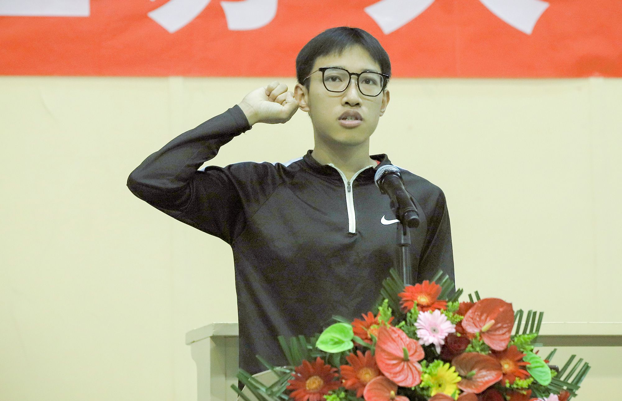 裁判员代表、体育部教师朱彪代表全体裁判员宣誓,运动员代表、第23届全国大学生田径锦标赛男子甲组200米冠军获得者、财经学院本科生周健豪代表全体运动员宣誓。