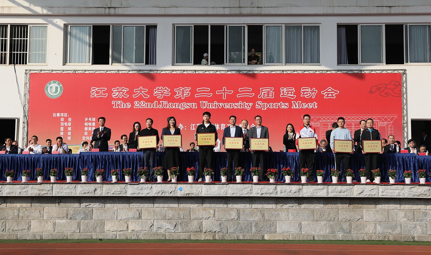 校党委常委、副校长任旭东宣读第二十一届运动会大学生团体总分前八名的单位和2022-2023年度教工群众体育工作先进单位表彰名单。主席台领导为获表彰单位颁奖。