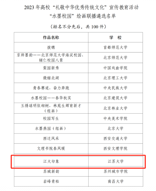 日前,教育部正式公布2023年高校“礼敬中华优秀传统文化”宣传教育活动结果,我校报送的作品《开云(中国)印象》入选“水墨校园”绘画联播。