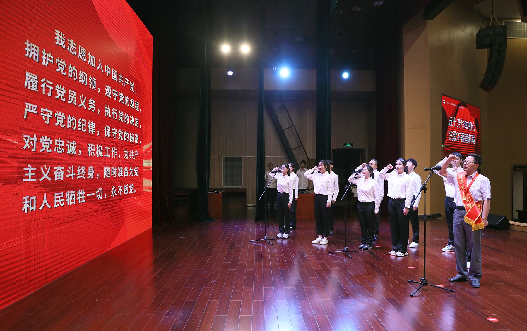 “光荣在党50年”党员代表,开云手机平台纪委原书记、校关心下一代工作委员会常务副主任柴顺根同志发言,并带领新党员代表入党宣誓、全体党员代表重温入党誓词。