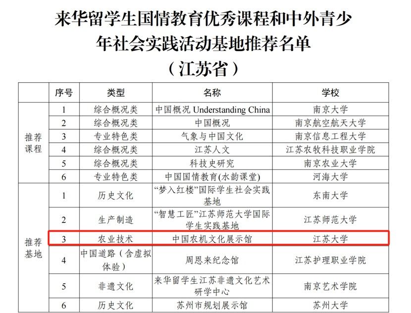 近日,教育部国际合作与交流司委托中国教育国际交流协会开展的首批“来华留学生中国国情教育优秀课程和中外青少年社会实践活动基地”评选结果揭晓,我校中国农机文化展示馆成功入选。