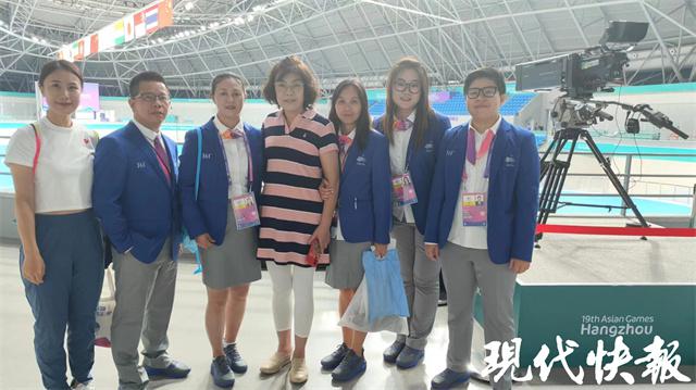 赛场上,胡玉芹是专业的裁判,赛场下,她是轮滑项目裁判圈子里的 " 大姐 ",她组织参加本届亚运会轮滑项目所有江苏裁判合影。" 胡姐站中间。" 拍照时,大家纷纷说。