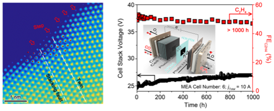 可再生能源驱动的电催化CO2还原技术(ECO2R)作为“双碳”背景下重要的资源化利用技术,因其可产生高附加值化学品、实现碳循环,减少温室气体排放等优势而受到广泛关注。该研究论文针对CO2电解还原系统中碳酸盐形成、电解质损失等难题,致力于提高电催化CO2还原系统的稳定性、耐久性,通过构建高性能的晶界与堆垛层错型Cu基催化剂,从而强化了C-C偶联反应,在流动相电解池中乙烯产物的选择性突破80%;同时研制出以纯水供给的膜电极系统,最终实现了ECO2R系统在工况下长达1000小时的稳定性,并且无CO2和电解质的损失,有效解决了困扰ECO2R领域的碳酸盐沉积问题。该研究工作有力推动了电催化CO2还原技术的实际应用,并和相关企业积极推进产业化落地。