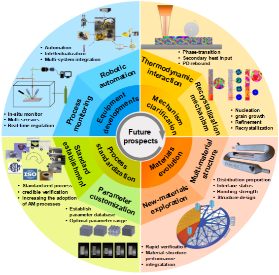 论文全面梳理了基于性能控制的复合增材制造技术在残余应力拉-压转换、冶金缺陷闭合、微观结构调控、力学性能改善和各向异性优化的原理,总结了熔池-能量场耦合及热-力交互过程中晶粒形核、生长、再结晶过程。最后,对复合增材制造技术在多能场制造、新材料开发、装备自动化和加工标准制定等方面面临的挑战和发展趋势进行了分析和展望。复合增材制造技术为极端服役环境下复杂精细构件高性能、高寿命、以及高可靠性一体化制造提供了一种全新的途径。