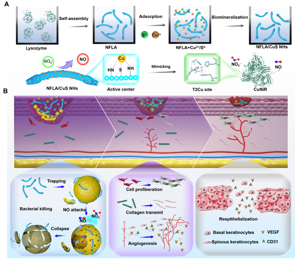 在本研究中,团队通过生物矿化构建了一种CuNIR模拟物(溶菌酶自组装纳米纤维/CuS纳米杂化物,NFLA/CuS NHs),该模拟物能够催化亚硝酸盐生成NO,其中超小CuS纳米颗粒作为活性中心,而NFLA作为具有辅因子作用的骨架。研究揭示了CuNIR模拟物增强的催化活性与其特定结构之间的密切关系,NFLA表面暴露的超小CuS簇和Cu原子结构以及NFLA在模仿CuNIR固有活性中的特定辅因子效应(如对抗坏血酸的良好亲和性)在速率决定步骤中的重要性。研究表明,以上两个因素协同作用,共同增强了催化活性。