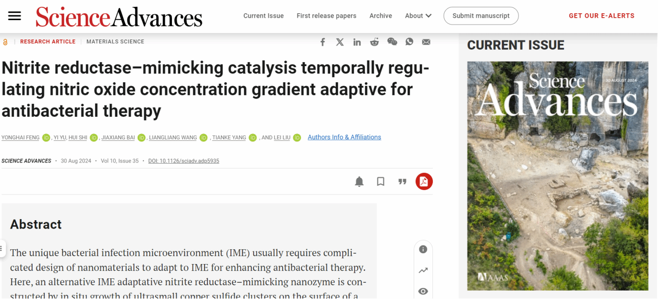 近日,我校材料科学与工程学院新材料研究院刘磊、冯永海团队在Science子刊《科学进展》(Science Advances)上在线发表研究论文“Nitrite reductase–mimicking catalysis temporally regulating nitric oxide concentration gradient adaptive for antibacterial therapy”。开云手机平台为第一完成单位,冯永海副研究员为第一作者,刘磊研究员为最后通讯作者,南京医科大学附属常州二院王亮亮博士、中国科学技术大学附属第一医院杨甜柯博士为共同通讯作者。